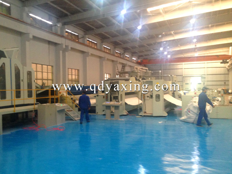 開包機(jī)3臺-輸送機(jī)-粗開松機(jī)-立方混料機(jī)-精開松機(jī)-喂棉機(jī)-雙錫林雙道夫梳理機(jī)-高速鋪網(wǎng)機(jī)-夾持簾-中速預(yù)刺機(jī)-中速主刺機(jī)-收卷機(jī)